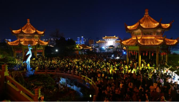本次嘉年华贯穿整个农历春节,以“马”为核心意象与精神纽带,既呼应生肖主题,也寄托武汉新一年“一马当先、奔腾不息”的城市精神。小年夜(2月11日),武汉园博园70余组大型花灯沿3.2公里长廊集中点亮,围绕“马到成功”等五大主题板块,生动再现荆楚年俗场景。武汉籍演员程莉莎、郭晓东携家人回到家乡逛灯会、猜灯谜,与游客共同重温儿时记忆,带动园博园灯会成为新春打卡热点。大年初二(2月18日)晚,嘉年华重头戏“龟山电视塔·天马行空光影秀”震撼上演,4000架无人机腾空而起,以龟山电视塔为主轴,在武汉一桥两山上空铺展巨幅红灯笼立体画卷,营造出强烈的节日仪式感。光影秀获央媒平台相继报道,外交部发言人林剑在海外社交媒体平台发布相关视频并配文推介,引发众多国外网友点赞。大年初四至初七,长江荣耀号、黄鹤楼、咸安坊、昙华林等地标接连推出“船说武汉·江上非遗年”主题航班、老街区非遗市集、城市漫步(city walk)等活动,陈铭、陈超、胡嘉欣、李小雷、何晟铭、赵粤等嘉宾走进景区街巷,与游客共同体验敲钟祈福、非遗互动、民谣演出等环节,进一步激活武汉老街区的人间烟火气和新春氛围,获得全国各地游客的高度评价。